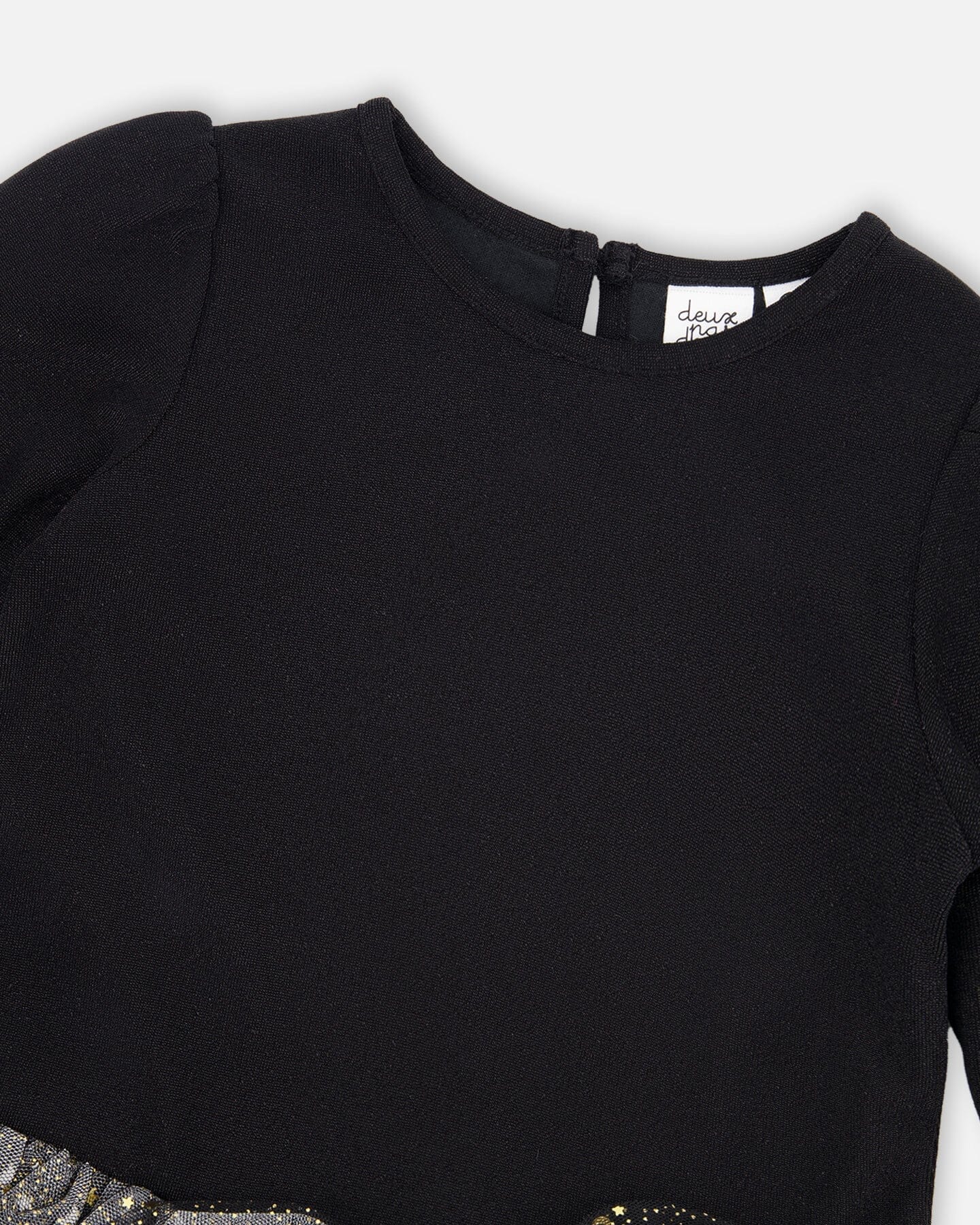 Our Glittering Mesh Skirt Party Dress Black is made for magical moments and twirls on the dance floor. This elegant long-sleeve party dress features a sparkly jersey bodice, a tiered glitter mesh skirt, and a matching fabric flower at the waist. A charming keyhole closure in the back adds the final touch, perfect for holiday celebrations and festive family gatherings.