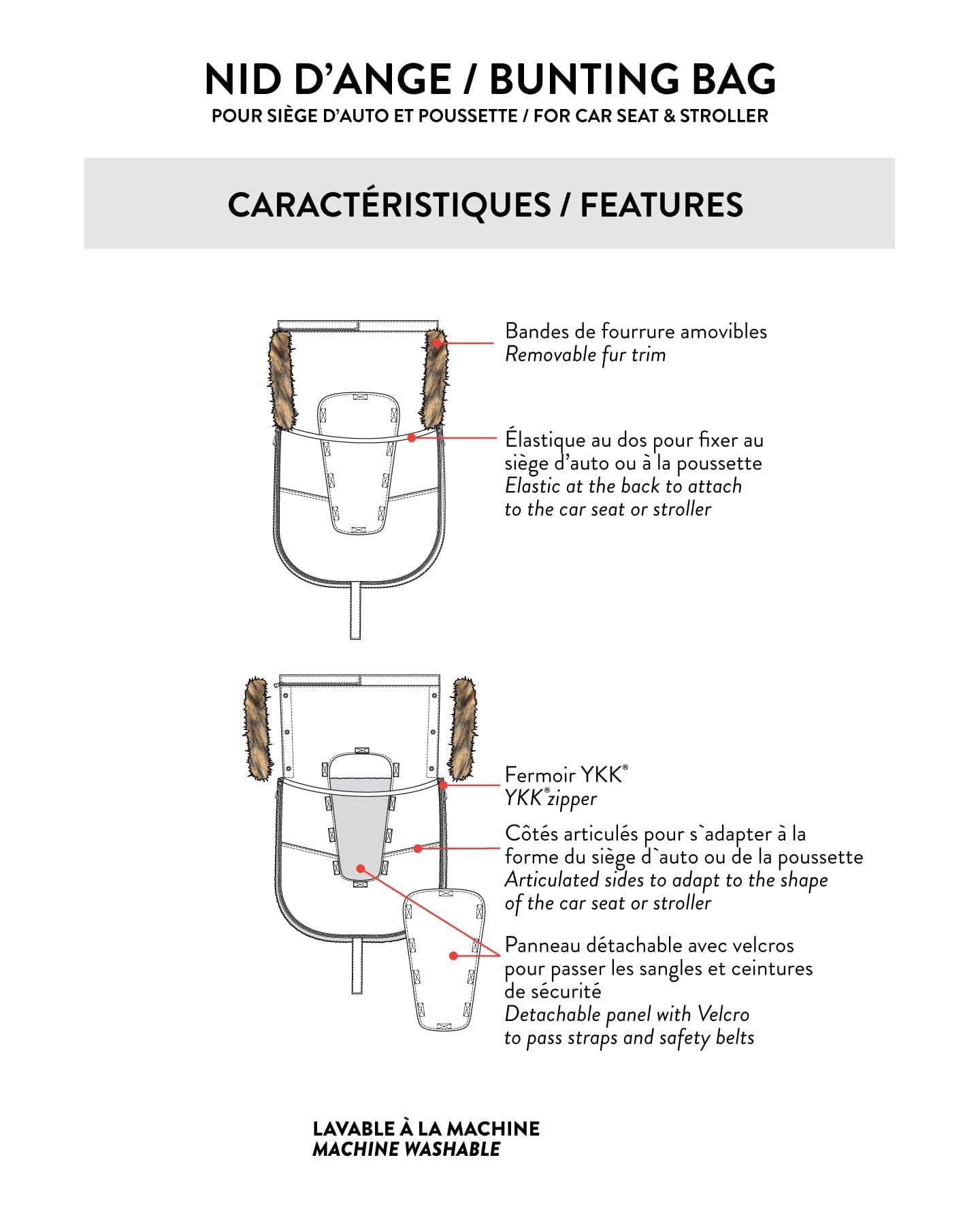 This snuggle bag for babies provides superior warmth and comfort in temperatures down to -20°C (-4°F). Breathable with a waterproof coating to keep infants dry, this bunting bag in purple gray is car seat compatible with fully detachable back and side zippers that allow for full opening. It’s lined with soft velvet and features a convertible top that can be turned into a hood. A sherpa-lined velour beanie and blanket are included for added warmth.