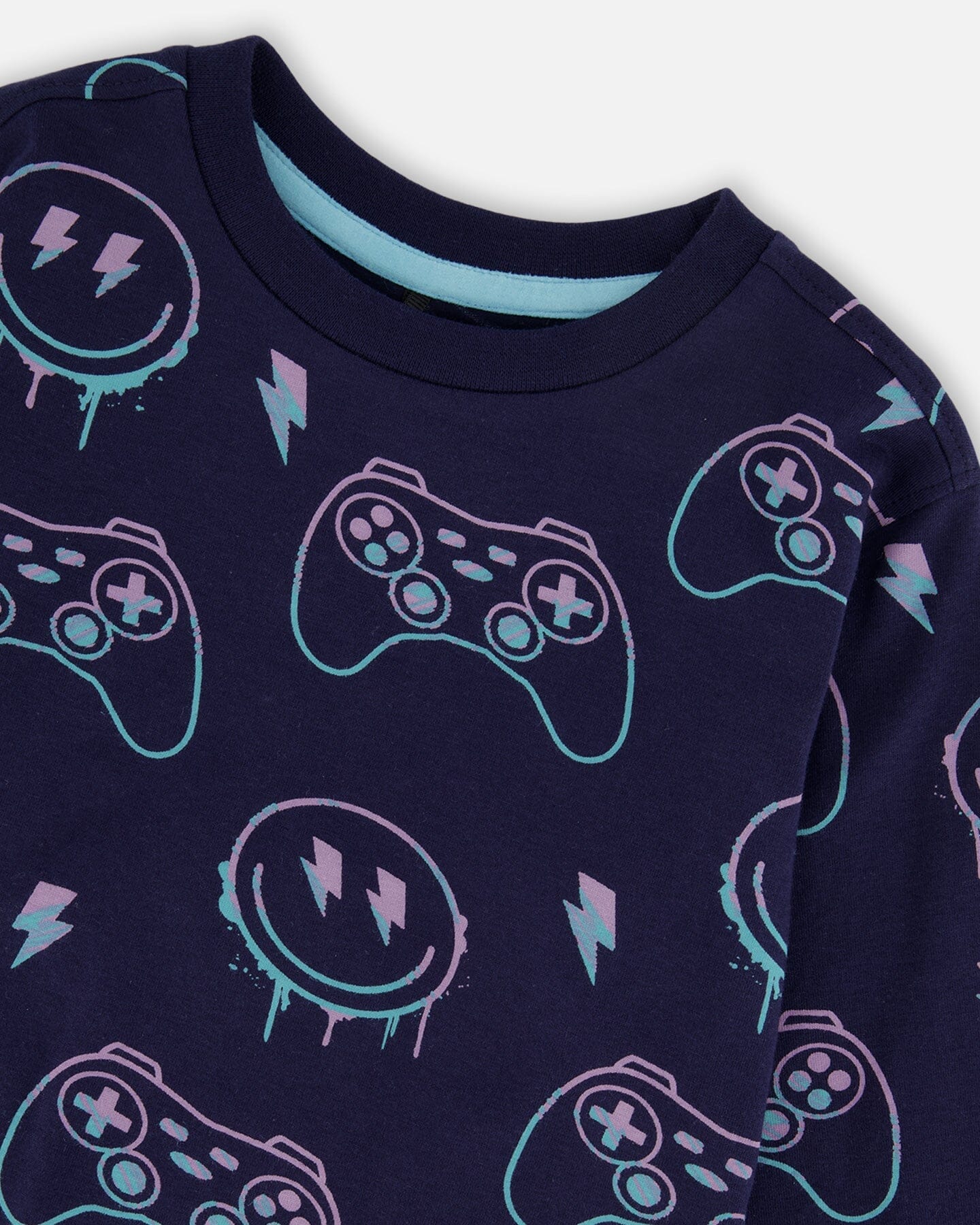 Long Sleeve Organic Cotton Allover Print Tee Navy Blue