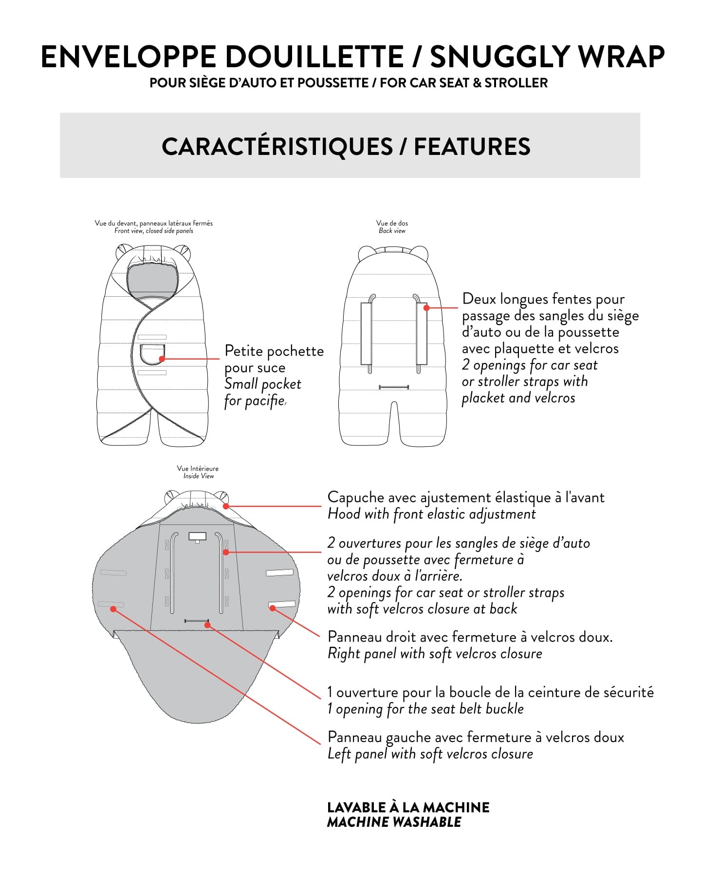 Baby will be oh-so-cozy and warm in our Snuggly Wrap Silver White For Car Seat and Stroller. Detailed with a water-resistant and weather-resistant coating, this adorable outer layer features a wrap silhouette with velcro flaps and openings to easily thread safety belt buckles and car seat and stroller harnesses. It's lined with soft plush fabric and includes adorable animal ears and a convenient little front pocket to hold a pacifier.