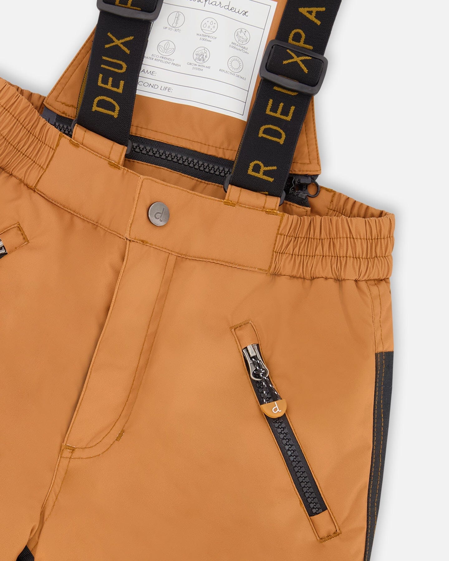 Waterproof, breathable, and insulated for cold protection down to -30°C (-22°F), our two-piece PLAY ski suit in brown sugar with a dinosaur print jacket is designed for maximum comfort, warmth, and performance in the snow. This winter snowsuit features a fleece-lined jacket with a detachable and adjustable hood, articulated sleeves for improved range of motion, elastic cuffs, a snow skirt, expandable sleeves so you can adjust the length as the child grows, and a protective wind flap and chin guard. The pants are constructed with Cordura®-reinforced panels for long-lasting durability, articulated knees, adjustable and removable suspender straps, ankle snow guards, and zippered pockets to hold ski passes and other essentials.